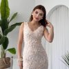 Onu butonlu uzun krem renkli elbise