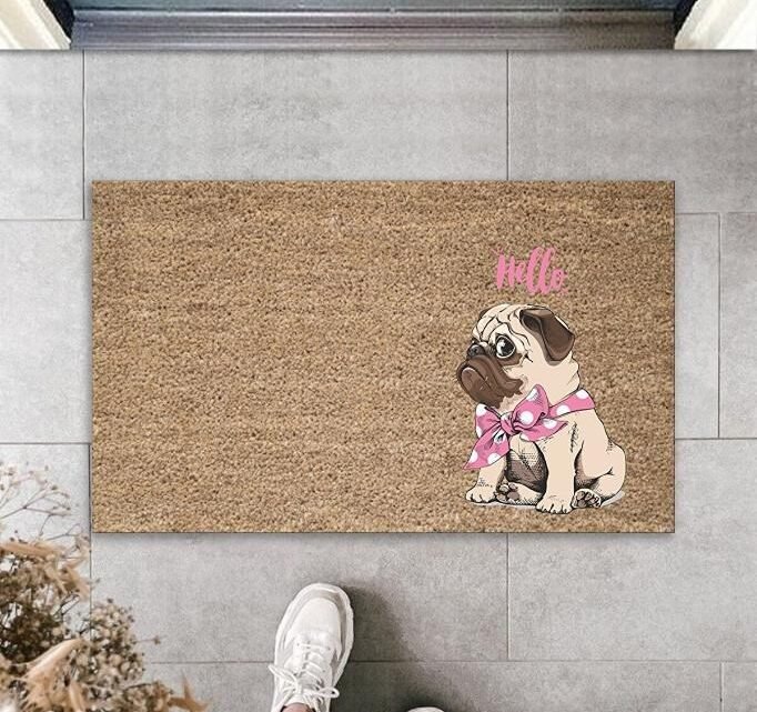 Dijital Baskı Kahverengi Hello Yazılı Pembe Fiyonklu Köpek Dekoratif Kapı Paspası K-2069