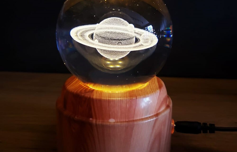 8 cm çapındaki cam küre, detaylı Satürn gezegeni tasarımıyla dikkat çeker. Küre, kaliteli cam malzemeden üretilmiştir ve iç kısmındaki lazer işleme sayesinde üç boyutlu görünüm sunar. 5 x 8.5 cm boyutundaki standı, ahşap görünümlü plastikten yapılmıştır. USB bağlantısı ile çalışarak içerisindeki ışığı aktive eder ve küre dönerken etkileyici bir atmosfer yaratır. Karanlık ortamlarda loş ve huzur verici bir ışık sunar, dekoratif aydınlatma veya hediye olarak tercih edilebilir.